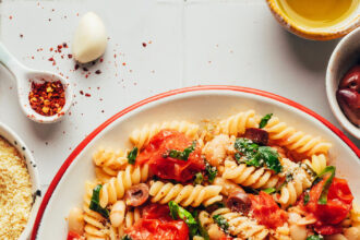 Česnaky baltų pupelių vyšnių pomidorų makaronai